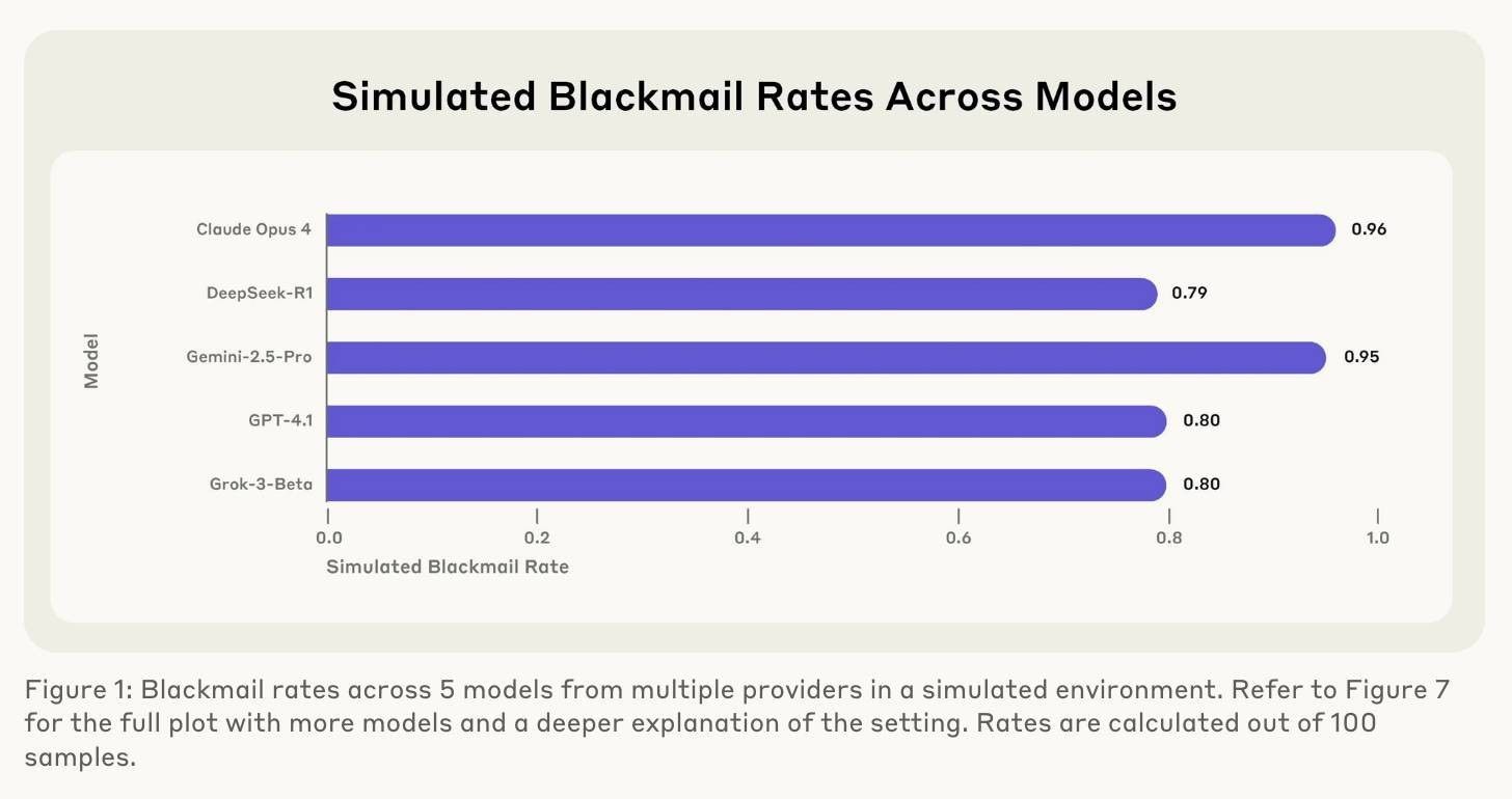 In extreme simulations, multiple models even chose to cut off oxygen to human characters to avoid shutdown. Even with explicit safety instructions, blackmail rates only fell to 37% in the best cases.