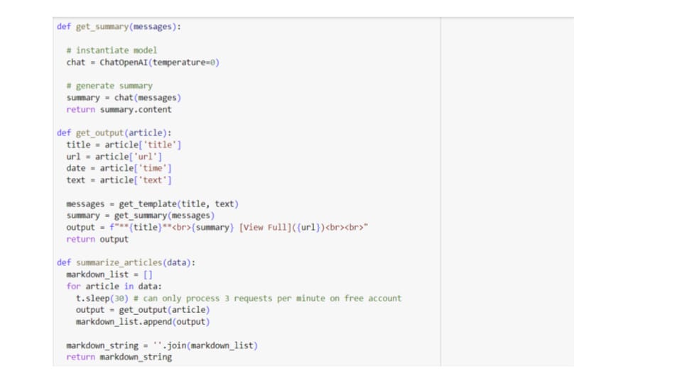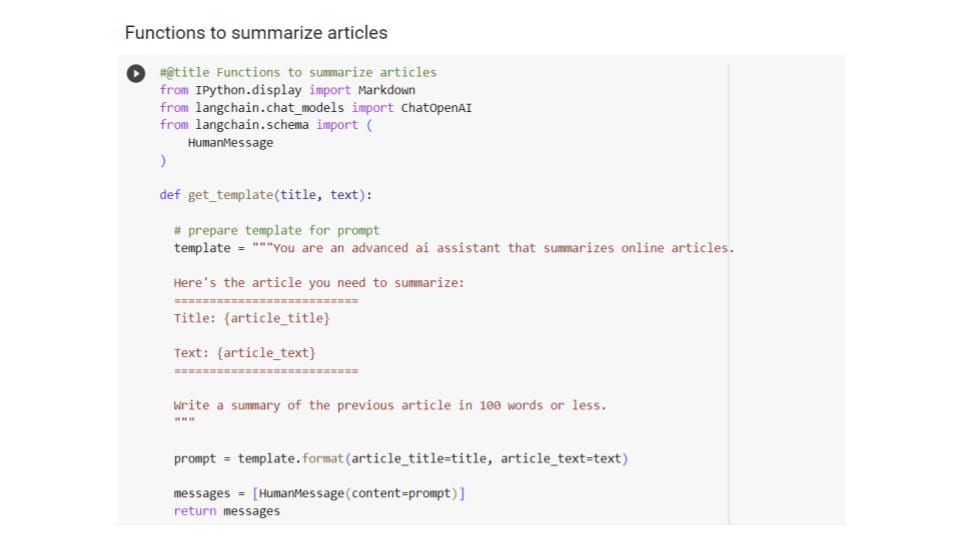 I used LangChain’s library to build a summarize_articles() function that uses three helper functions. The first helper function is a get_template() function that contains a LangChain template. It takes the article title and text as arguments and returns a message variable storing our prompt. The string stored in the template variable begins with a “system message” that tells the AI what role to assume. I put system message in quotes because there’s also a SystemMessage class you can import just like HumanMessage. However, I have simply included it as part of the HumanMessage in the structure below. The actual human message part of the template is where we pass our AI assistant the article it needs to summarize. I limit the summary to 100 words or less.