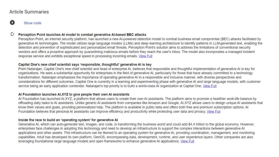 It’s easy to create user-friendly GUIs in Colab. There are native markup commands that allow you to create dropdown lists, user forms, etc. I used these commands to clean up my notebook and add functionality that lets users select what date(s) for which they want to display article summaries. There’s also an IPython.display library that allows us to display generated output as markdown in our notebook. Using this, we can take the string output from our summarize_articles() function and display it in a user-friendly way. The result is the neat summaries below with links to the full articles in case we want to click through.