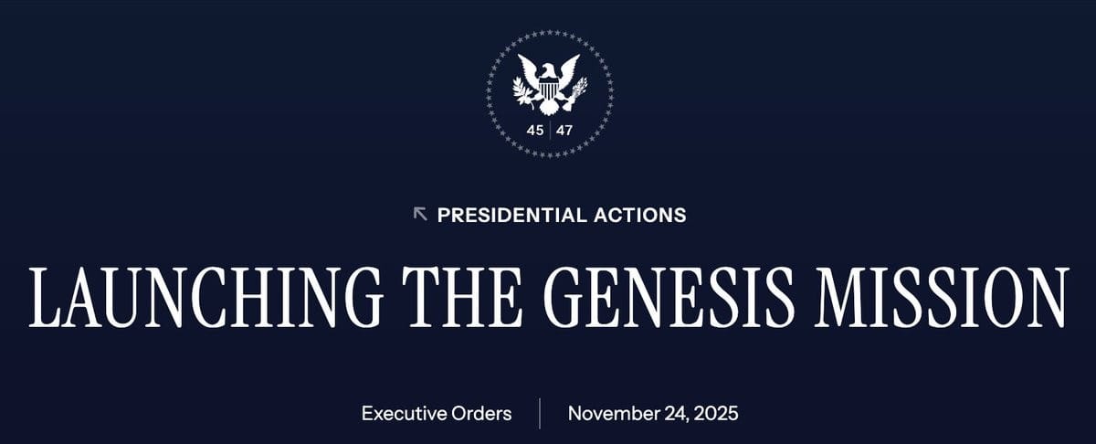 News: President Trump has launched an executive order creating the Genesis Mission, ran out of the Department of Energy. The central mission is to apply AI and supercomputing to “pressing national challenges” across domains like advanced manufacturing, biotech, fusion, quantum, and semiconductors. With the support of DOE’s 17 national labs, this marks the largest American infrastructure investment in AI yet.