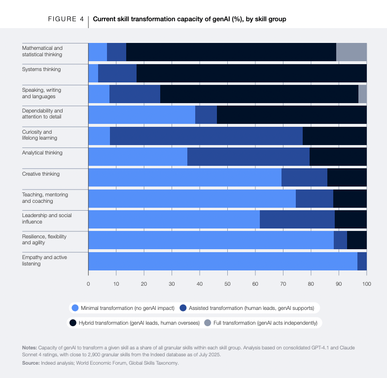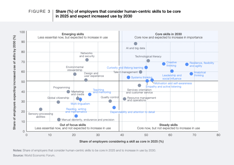 A 2025 World Economic Forum white paper highlights that employers continue to prioritize skills like analytical thinking, creativity, resilience, and leadership, while also noting uncertainty about which of these skills genAI will meaningfully improve. This supports a cautious approach: assume some skills will not be ‘automated away’ in how people actually work together.