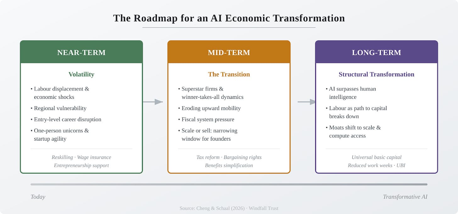 These framings miss the essential point: We need distinct interventions to manage the different stages of the transition to an AI-driven economy. Right now, the best move for those of us exploring these topics is to be prepared - to visualise and describe the entire roadmap from near-term disruption to the inevitable restructuring of the economy. With an integrated roadmap, the wide range of policy ideas can become more coherent, and we can better help policymakers and entrepreneurs look further down the line into a very different future. Below, we outline one such roadmap.