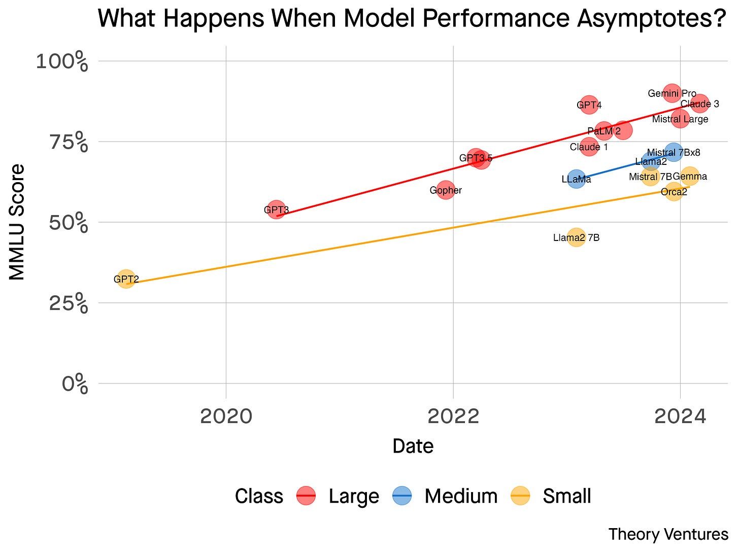 So, what does all of this mean for the future of software, jobs, and Generative AI? Well, the industry has already studied the profound productivity gains of copilots integrated with the current batch of best-in-class foundation models—Github has released studies showing 50%+ productivity gains among developers and ServiceNow has communicated 60-80% increases. As foundation models continue to scale performance to near (or even surpass) human benchmarks and agent frameworks unlock faster time-to-value for autonomous agent development, the future of work will fundamentally change. Today, the highest performing models are 90% as capable as a high school student (the MMLU benchmark for AI).