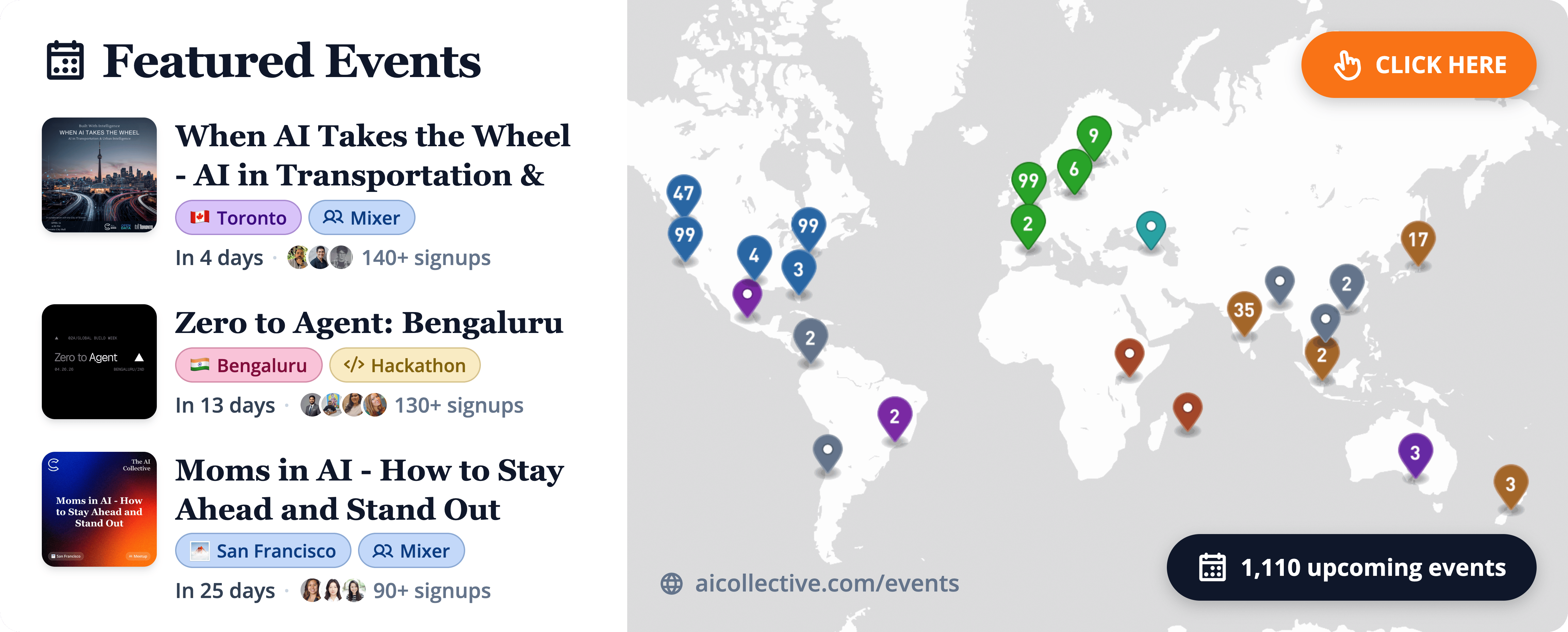 Head over to our Events Portal to get the latest on upcoming AI Collective events near you. Search by city, date, or event format, and join thousands of builders at events across 180+ chapters on every continent (except Antarctica, for now).
