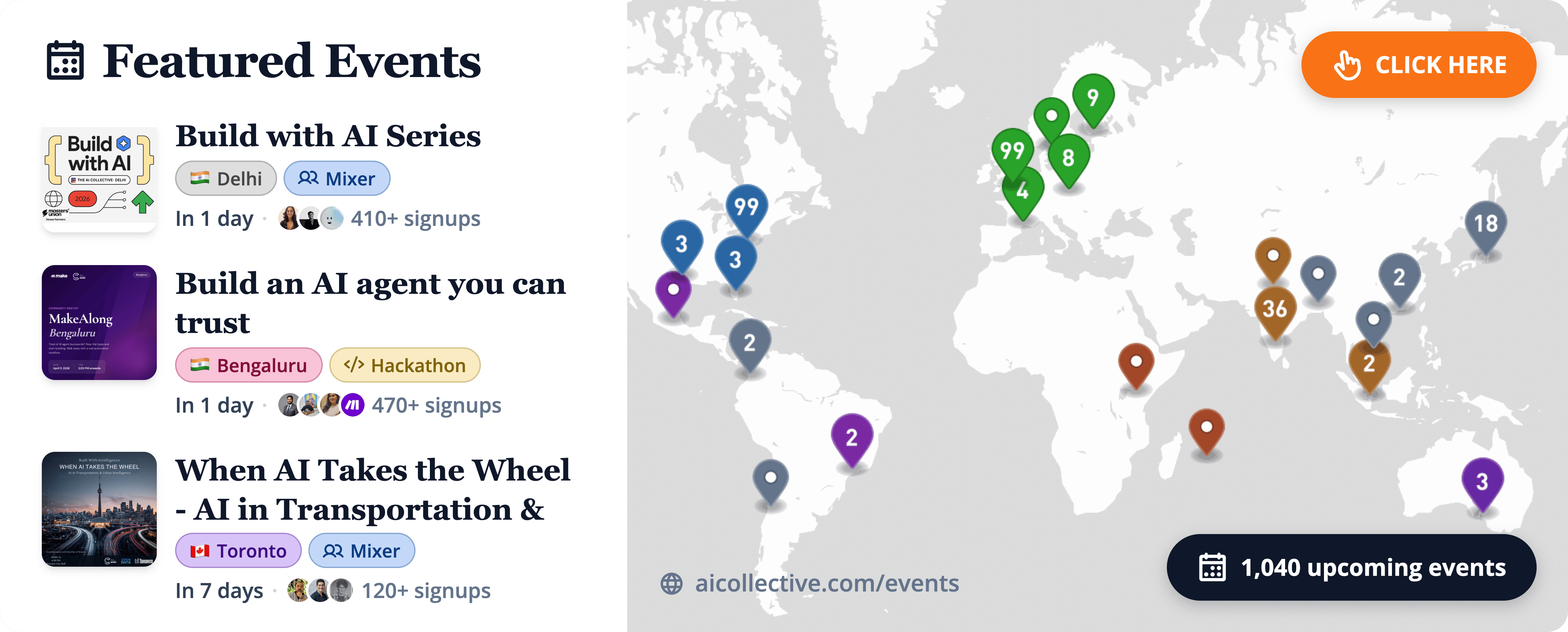 Head over to our Events Portal to get the latest on upcoming AI Collective events near you. Search by city, date, or event format, and join thousands of builders at events across 100+ chapters on every continent (except Antarctica, for now).